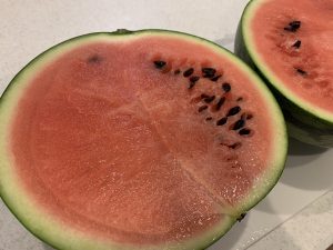 果肉がしっかり詰まっていてみずみずしい。カットするとスイカの中心部分が三角の先端になっているが、カットした時にこの部分のエッジがしっかり出ているのも美味しそうだ。スイカは食べ頃を過ぎて日にちが経つと、どんどんと空洞が出来始める。これは、種が果肉の栄養分を吸い取っていることで起きる。せっかく大事に育ててくれたスイカ農家のご苦労を無駄にすることなく、美味しい食べ頃の状態で頂きたい。