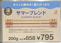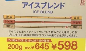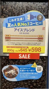 夏の季節はアイスコーヒー用としての豆がショーケースに協調されて並んでいる。