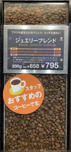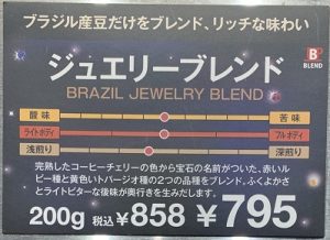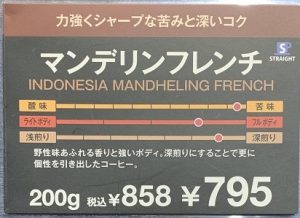 キャプションの説明書きには、「野性味あふれる香りと強いボディ。深煎りにすることで更に個性を引き出したコーヒー。」とのことだ。価格は、先のジュエリーブレンドと同じ200gで858円。一杯あたり約53円といった値ごろ感だ。