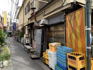 お店の横には、空のビール瓶やケースが積み重ねられている。おしぼりケースだろうか、プラスチックの青いカゴもある。