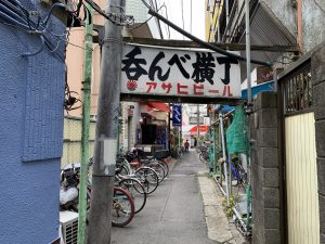 細い木枠に手書きで書かれた「呑んべ横丁」という門。やや哀愁も漂うが、このへんの雰囲気も下町風情を大いに感じる要素だ。