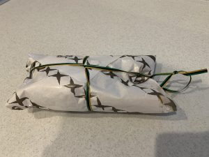 紐を解いて紙包みを開くと、さらにビニール袋に入った経木シートに包まれていた。ここでも先ほどとは違う白い紐で縛られている。大事にされている感が漂ってくる。